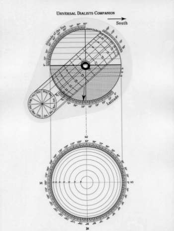 "Mostrando-se Companheiro") A idéia do "Dialling Buddy" ("Mostrando-se Companheiro") se originou com a descoberta do "Universal Dialists Companion" de Mike Shaw (UDC). Mike é um gnomonista que reside no Reino Unido e desenvolveu o dispositivo ilustrado na Figura 1. A UDC é uma excelente ajuda para quem está interessado em gnomonismo. Mike também escreve uma ótima apresentação que discute a teoria por trás do projeto da UDC, bem como fornece exemplos que mostram como usar o dispositivo.