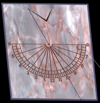 terminação do estilo de cordão na posição correta. Imagem ampliada, de um relógio de sol de Sombra Plana Horizontal, com sua sombra projetada, clique aqui. Em