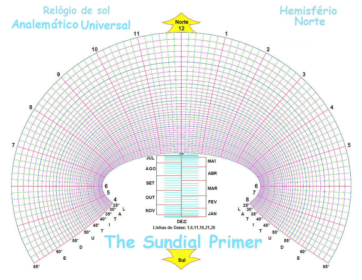 Figura 2: Layout Relógio de sol Analemático(CAD) A dimensão horizontal "X" do ponto "O" é: X = sin h onde h é o ângulo horário, em graus, determinado por: h = (T24 - 12) * 15° e T24 é o tempo em notação de relógio convencional de 24 horas (horas após a meia-noite), em horas decimais. A dimensão vertical "Y" do ponto "O" é: Y = sin ø * cos h Observe que o cálculo de "X" requer apenas o ângulo horário e seria o mesmo para um mostrador em qualquer latitude. A dimensão "Y" depende da latitude. O próximo passo é estabelecer a escala de datas. Esta é a escala que é usada para determinar a posição do gnômon em um determinado dia do ano. Os pontos da escala podem ser determinados para qualquer dia do mês, mas tipicamente o primeiro dia é usado e os Solstícios de Verão e Inverno estabelecem os extremos da escala. A escala de datas é determinada da seguinte forma: S = tan (dec) * cos ø onde "dec" é a declinação do Sol. Para maiores detalhes, verifique a página "Relógio de sol Analemático". É possível manipular as equações acima para criar um relógio Analemático Universal. Para fazer isso, a equação para a escala de datas deve ser feita independente da latitude "ø". Isto é feito dividindo as três equações pelo termo "cos ø". Como resultado, as equações tornam-se: X = sin h / cos ø Y = tan ø * cos h S = tan (dec) A escala das datas depende agora somente da declinação do Sol para toda a latitude. As coordenadas X e Y podem ser calculadas para qualquer número de pontos horários, em qualquer latitude. A Figura 3 ilustra o layout de um relógio Analemático Universal. Embora possa parecer que há linhas horárias, o tempo é determinado pelo ponto em que a sombra do gnômon cai sobre uma elipse de latitude específica. Este relógio de sol funcionará na faixa de latitude de 25° a 65° no Hemisfério Norte. Para o Hemisfério Sul, os números das horas serão invertidos e a escala das datas será uma imagem espelhada sobre o semi-eixo maior. As setas "Norte" e "Sul" estarão invertidas.