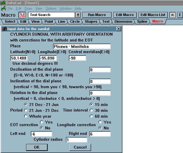 Figure 1: The Beginning of a New Macro This cylinder sundial is generated after the user enters the "Latitude", "Longitude" and "Central meridian" of the sundial's location as shown in Figure 2. A "Place" descriptor can also be included. Hour lines intervals of 15 and 30 minutes and one hour are available. The "Period" over which the sundial will be designed must also be selected. The hour lines can be adjusted for longitude and the Equation of Time. The "Left end" and "Right end" entries define the length of the cylinder over which the hour lines are drawn. The "Cylinder radius" determines the size of the cylinder.